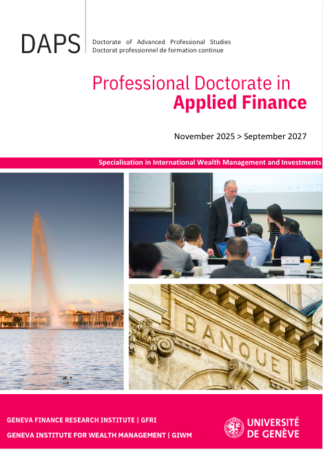 A brand new professional doctorate degree has been created in 2017 within the University of Geneva, the first of its kind in Switzerland ; the “Doctorate of Advanced Professional Studies in Applied Finance” provides academic excellence to train the wealth management professional of tomorrow.
